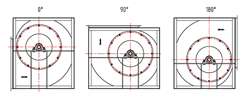 2.出風(fēng)方向 EDF系列風(fēng)機(jī)可制成0°、90°、180°三種出風(fēng)方向,如下圖所示。