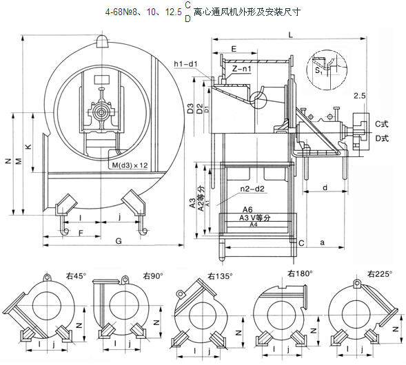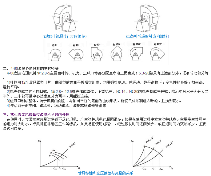 4-68型離心通風機可制成右旋轉和左旋轉兩種型式。從電動機一側正視。葉輪順時針旋轉,稱為右旋風機,以“右”表示;葉輪逆時針旋轉,稱為左旋風機,以“左”表示。風機的出口位置.以機殼的出風口角度表示。