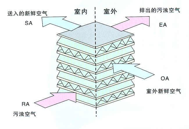 當室內空調回風和新風分別呈正交叉方式流經熱交換器時,由于平隔板兩側氣流存在著溫度差和水蒸汽分壓力差,兩股氣流間同時產生傳熱傳質,引起全熱交換過程。這種過程是經過平隔板完成的,所以,屬透過型全熱交換。當安裝在系統上的全熱交換器在夏季運行時,新風從空調回風中獲得冷量,使溫度降低,同時被回風干燥,使新風濕度降低;在冬季運行時,新風從空調回風中獲得熱能,使溫度升高,同時被回風加濕。就是通過這樣的全熱交換過程,讓新風從空調回風中回收了能量。
